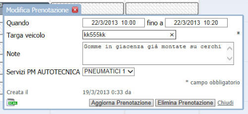 Qui di seguito una guida passo a passo relativa al servizio di prenotazione che la PM AUTOTECNICA offre a tutti i suoi clienti. In pochi e semplici passagi sarete in grado di prenotare comodamente da casa il vostro cambio gomme stagionale, oppure il tagliando o la revisione per il vostro veicolo.FASE 1: REGISTRAZIONEClicca qui e visualizza la pagina di accesso al servizio. I clienti della PM AUTOTECNICA, una volta completata la fase di registrazione, potranno prenotare il proprio cambio gomme con soli due parametri: l'indirizzo email e la password personale (vedi immagine a lato).La fase di registrazione si attiva cliccando sulla voce "Crea un nuovo account".Prima di questo potete optare per una delle tre differenti opzioni offerte dal programma. Quella impostata di default, "Mantienimi connesso", consentirà al vostro pc di memorizzare i due dati di accesso al servizio e quindi di gestire il tutto in modo automatico (basterà fare clic su "Entra"). La seconda opzione invece, terrà memorizzato il solo nome utente e dovrete ogni volta inserire solo la password scelta, mentre l’ultima opzione è in assoluto la più sicura e consigliabile, dato che verranno sempre chiesti entrambi i dati di accesso.Selezionata la voce "Crea un nuovo account", verrà visualizzato il form qui a lato dove si dovranno compilare tutti i campi obbligatori richiesti, indispensabili per gestire al meglio il servizio. I dati raccolti verranno utilizzati da PM AUTOTECNICA per il solo fine qui indicato.Una volta inseriti tutti i dati, cliccate su "CREA" A questo punto il vostro account è stato realizzato e il programma vi proietterà direttamente nell'interfaccia di prenotazione dei servizi della PM AUTOTECNICA. FASE 2: PRENOTAZIONEPer prenotare il cambio gomme inverno/estate scegliete uno dei due campi "PNEUMATICI 1" o "PNEUMATICI 2" che corrispondono alle due postazioni attrezzate dell'officina.Fatto questo, scegliete la data che preferite e ovviamente l'ora per voi più comoda nell'arco della giornata. Tutto questo, ovviamente, in funzione della disponibilità del momento.Per la selezione della data (mese e giorno) fate riferimento al calendario (vedi immagine sotto) nella parte destra dello schermo. Fatta questa operazione non vi resta che selezionare l'ora dell'intervento per il cambio gomme. Nella parte bassa del video sarà disponibile la settimana di riferimento relativa al giorno da voi scelto.La giornata è suddivisa in caselle, ognuna delle quali rappresenta un potenziale appuntamento selezionabile. Scelta una delle caselle libere e corrispondente all'orario a voi più comodo, verrà visualizzata la finestra "Nuova Prenotazione".Per completare la prenotazione sarà sufficiente indicare la targa del vostro veicolo ed eventualmente aggiungere qualche nota che possa agevolare il nostro lavoro, del tipo se avete in giacenza da noi le gomme estive, se queste sono già montate su cerchi oppure no ecc..Inseriti i dati richiesti basterà confermali cliccando con il mouse sulla voce "Crea Prenotazione".Il sistema non accetta prenotazioni se non sono programmate con almeno 48 ore di anticipo rispetto all'intervento. Se tutti i dati sono coerenti, la prenotazione andrà a buon fine e sullo schermo vedrete la casella da voi selezionata colorata e riportante sia l'ora della prenotazione che il numero di targa della vostra auto.Le prenotazioni effettuate sono modificabili oppure annullabili sempre con un ragionevole anticipo in caso di imprevisti. Una volta effettuato l'accesso al servizio, cliccando sulla casella della vostra prenotazione potrete modificare sia la data che l'ora per poi confermare le modifiche con un clic del mouse sulla voce "Aggiorna prenotazione", oppure eliminarla del tutto per farne una nuova cliccando sulla voce "Elimina prenotazione".Il sistema vi manderà in automatico una email di promemoria della prenotazione effettuata.Per qualsiasi problema riscontrato il personale della PM AUTOTECNICA rimane a vostra completa disposizione per ulteriori chiarimenti.